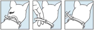 라. 그림과 같이 본 제품을 동물의 목에 감습니다. 손가락 두 개 정도의 여유만큼까지만 조입니다. 고리로부터 2Cm 이상 남는 잔여길이는 가위로 절단하십시오.